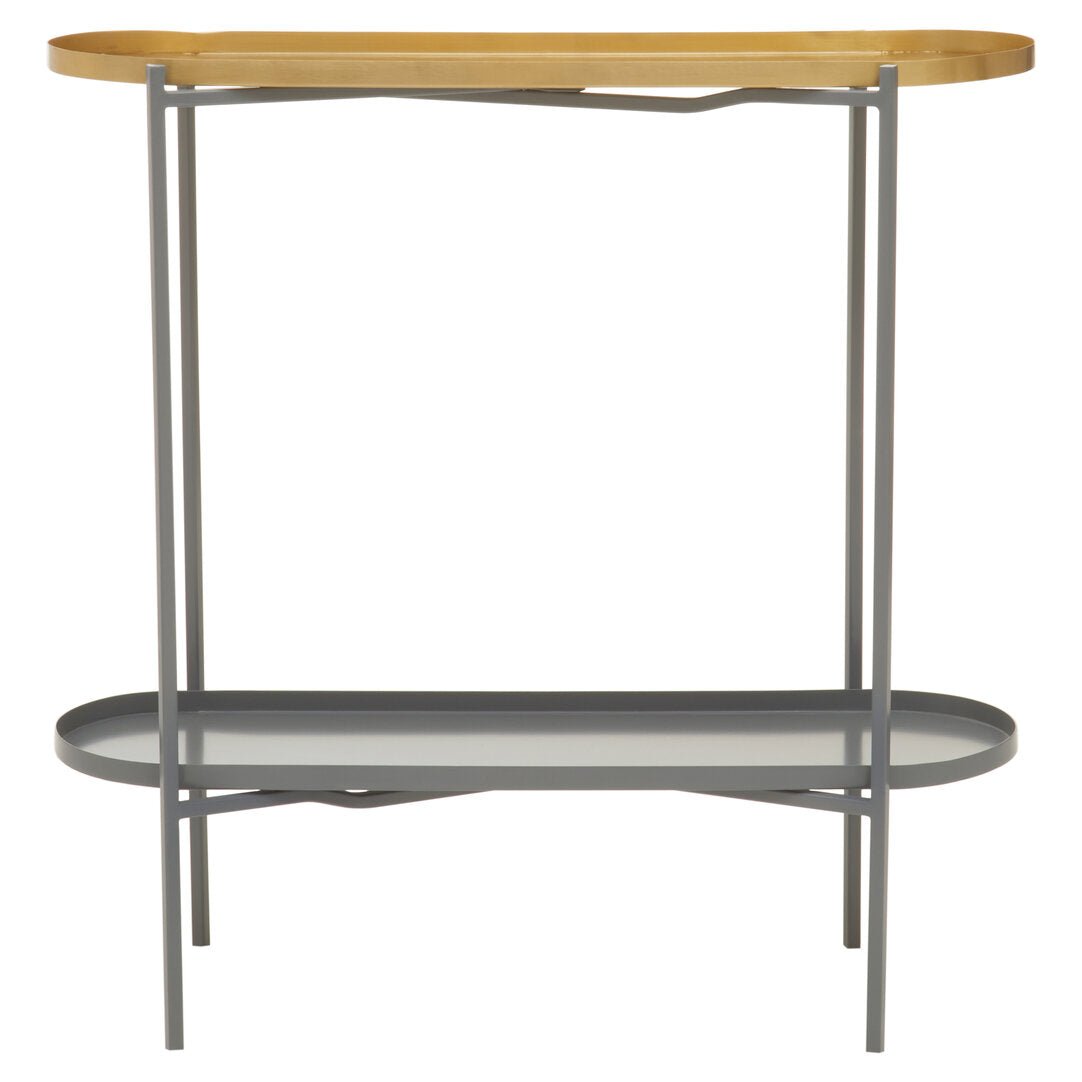 This console table features two oblong shelves with raised edges that are fixed neatly in a sleek and slender metal frame. The elegant contrast of matte gold and grey enamel coating enhances the modern glam appeal in the living area.
