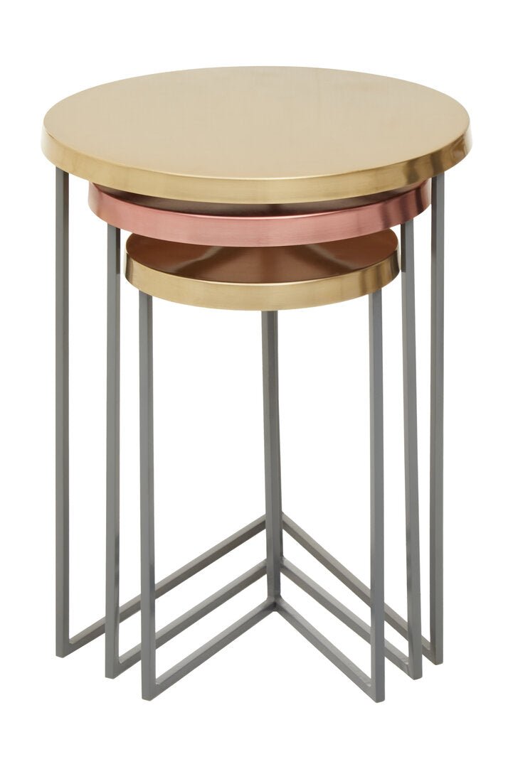 Each of the three Korba tables boasts a warm metallic round top and a slim grey finish metal base creating an angular profile. The size of these tables varies and effortlessly nestle together to make room in crowded places.