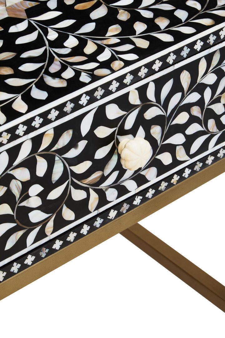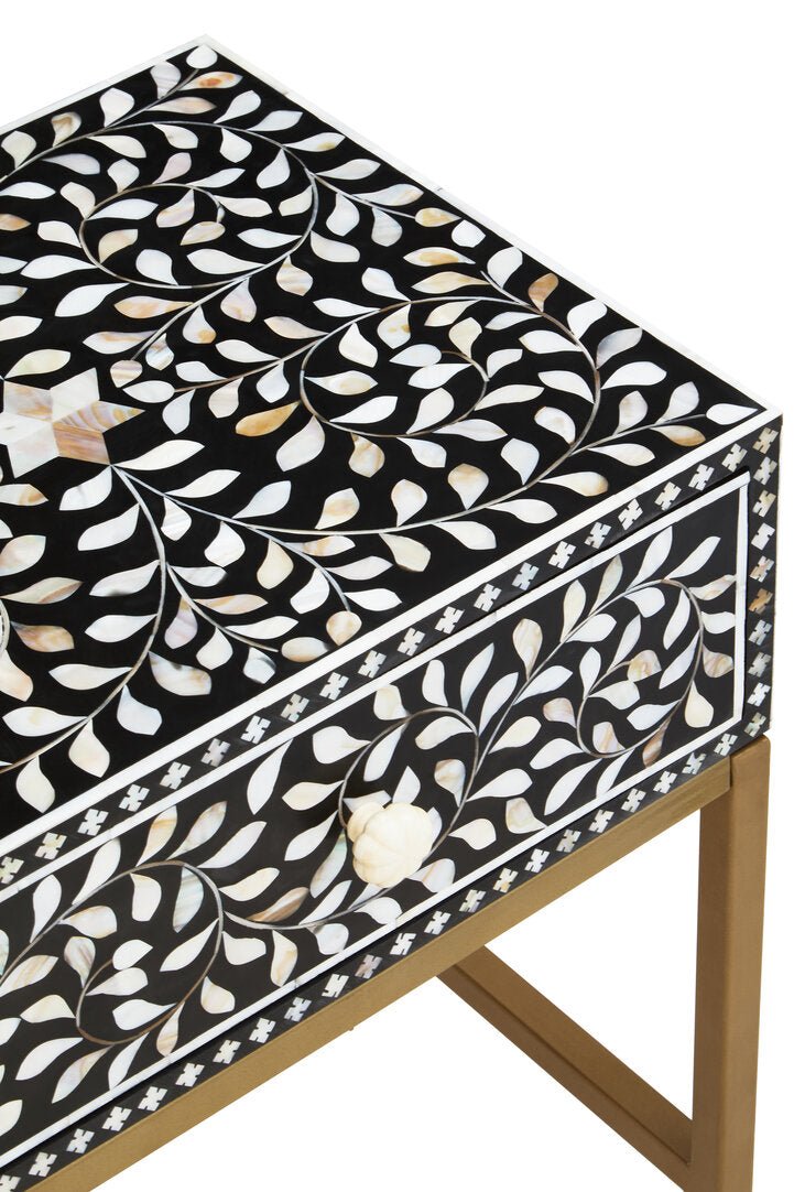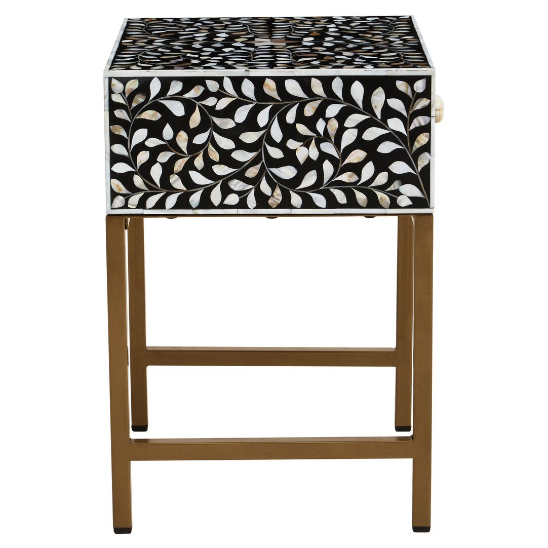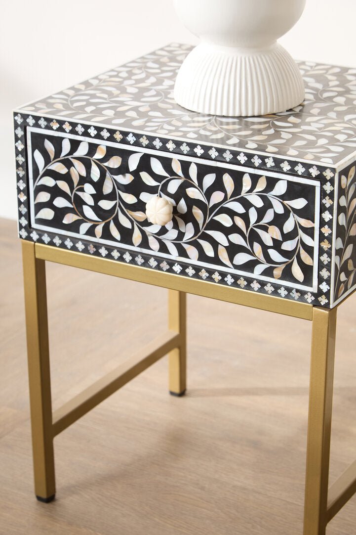This one-drawer side table features white mother of pearl fragments which are affixed by hand to form a detailed floral pattern on solid black wood. The drawer has a decorative carved floral grip that aligns with the timeless appeal of the design. The sleek antique finish legs contribute to the luxe sophistication of the exotic piece of art.