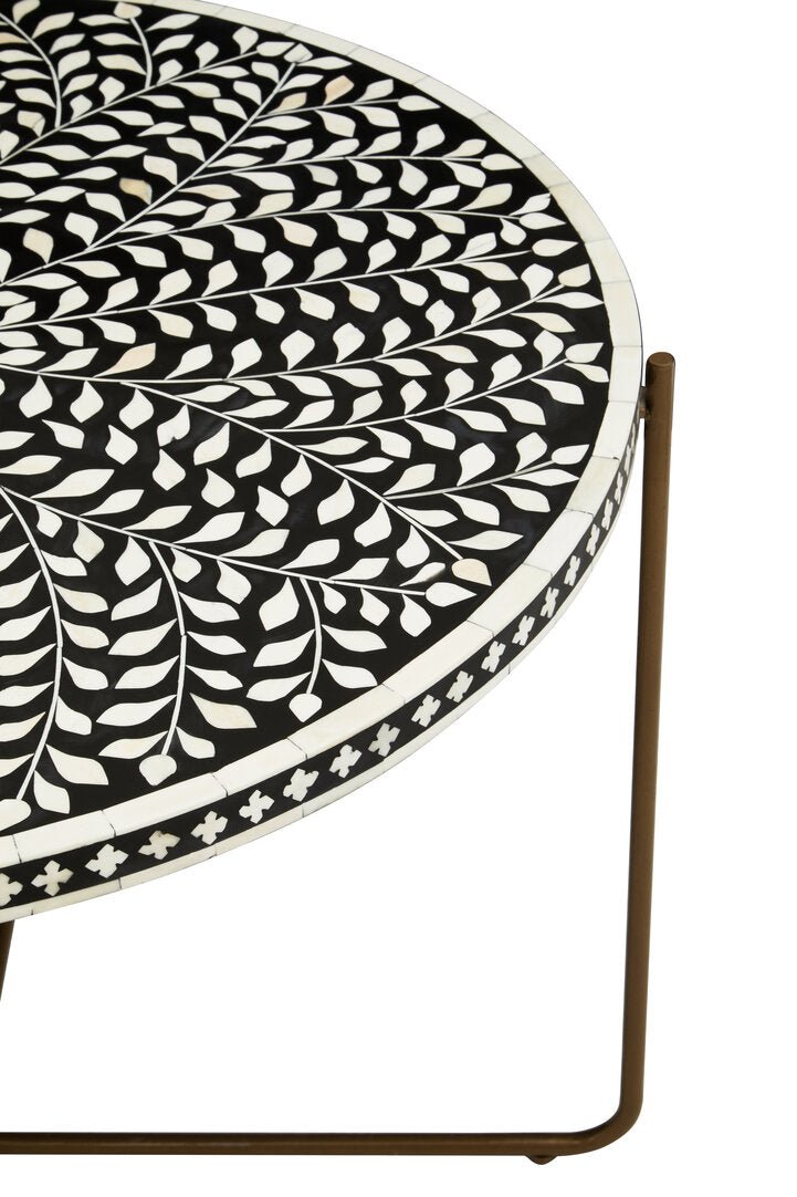 This coffee table features an intricate floral pattern made from individually laid white bone on black wood, creating a timeless appeal. The patterned top in unique detail is supported with sleek old finish legs featuring a modern cross design that counterpoints the traditional aesthetic.