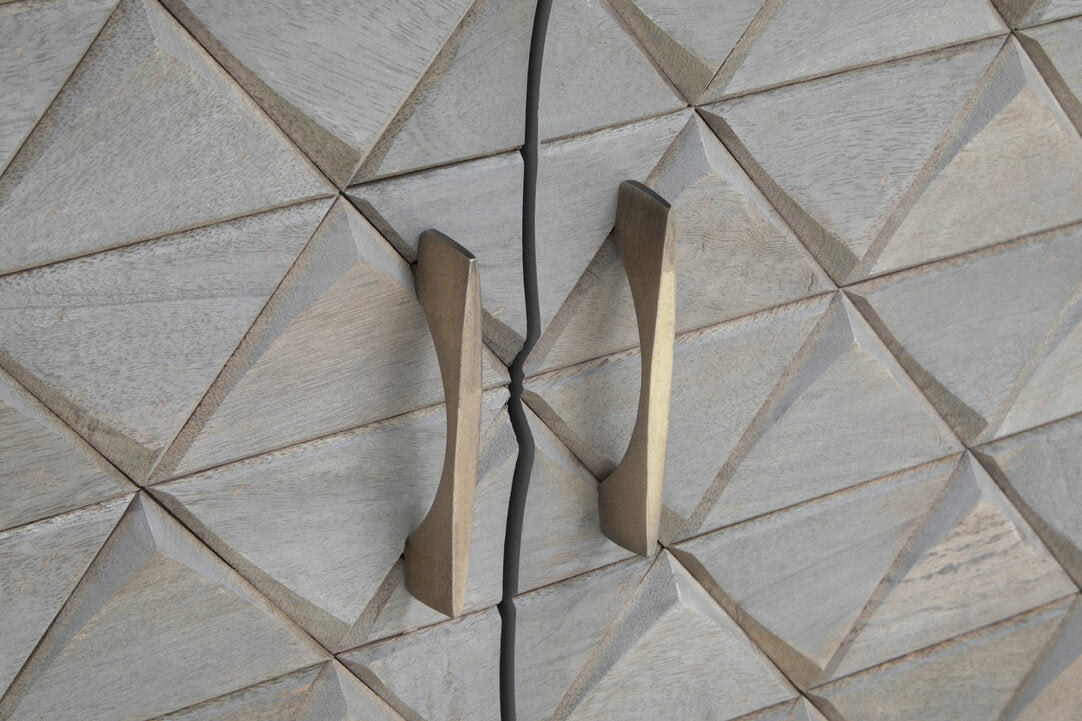 Made from mango wood in a grey finish, this modern sideboard has a roomy interior, supported by durable gold polished legs. The four doors across the front have a distinctive faceted pattern for a subtle texture which compliments the clean lines of the rectangular form.