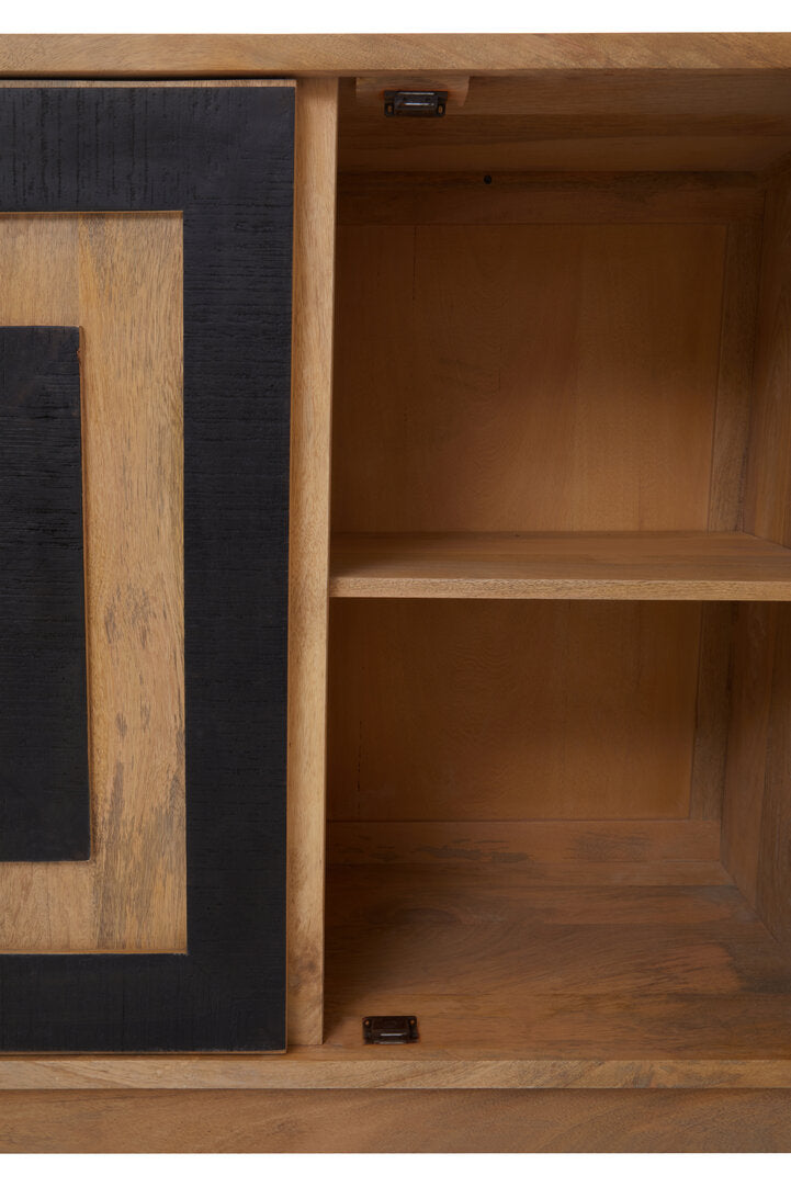 This large mango wood sideboard features a distinctive contemporary design with four spacious storage doors. The unit is defined by its striking, contrasting black geometric pattern overlaid on the natural wood, creating a bold, modern look.