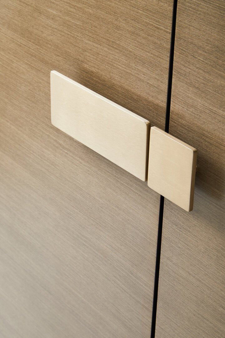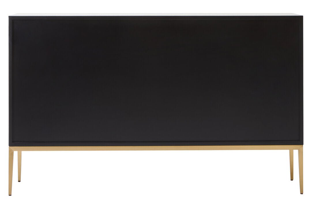 The Davoli sideboard featuring two tones and diagonal designs. The grains of the grey side are subtly contrasted by the fluted black side. The sideboard is complemented by gold finish metal handles and base.