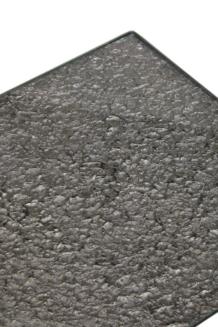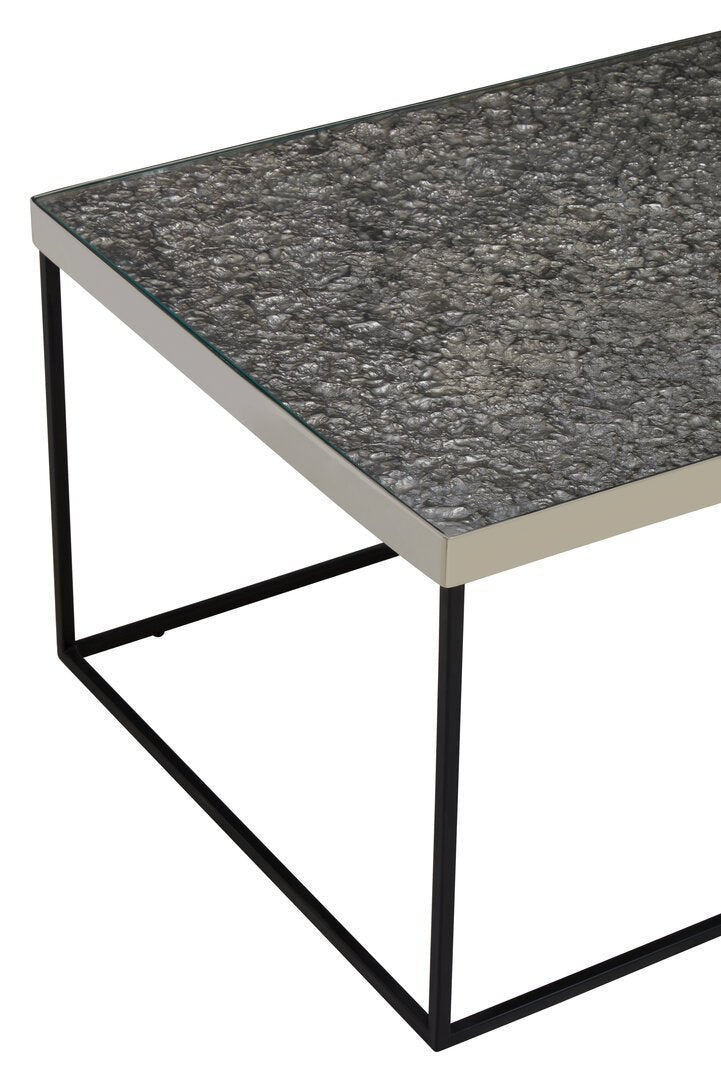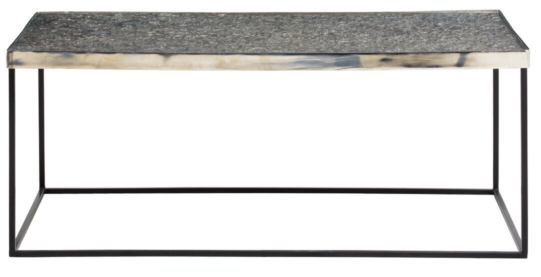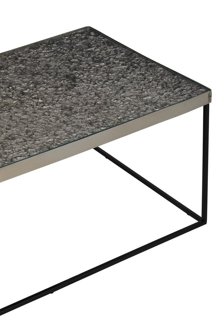 This sleek and modern coffee table features a metallic silver finish tabletop resting above a sturdy black structure with interconnected legs. This contemporary table goes perfectly with modern and minimal interiors.