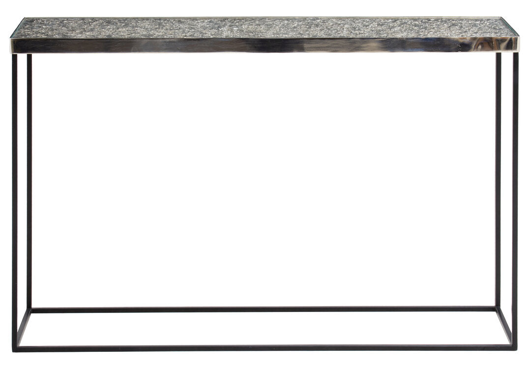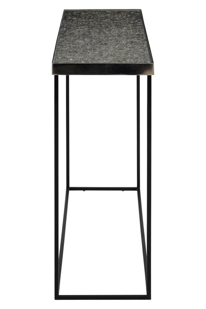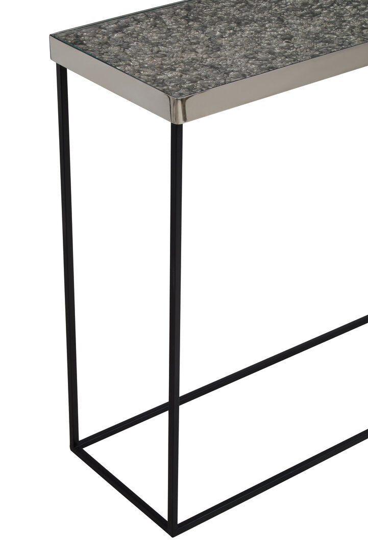 This sleek and modern console table has a metallic silver finish tabletop resting above a sturdy black metal structure with interconnected legs. This contemporary table goes perfectly well with modern and minimal interiors.