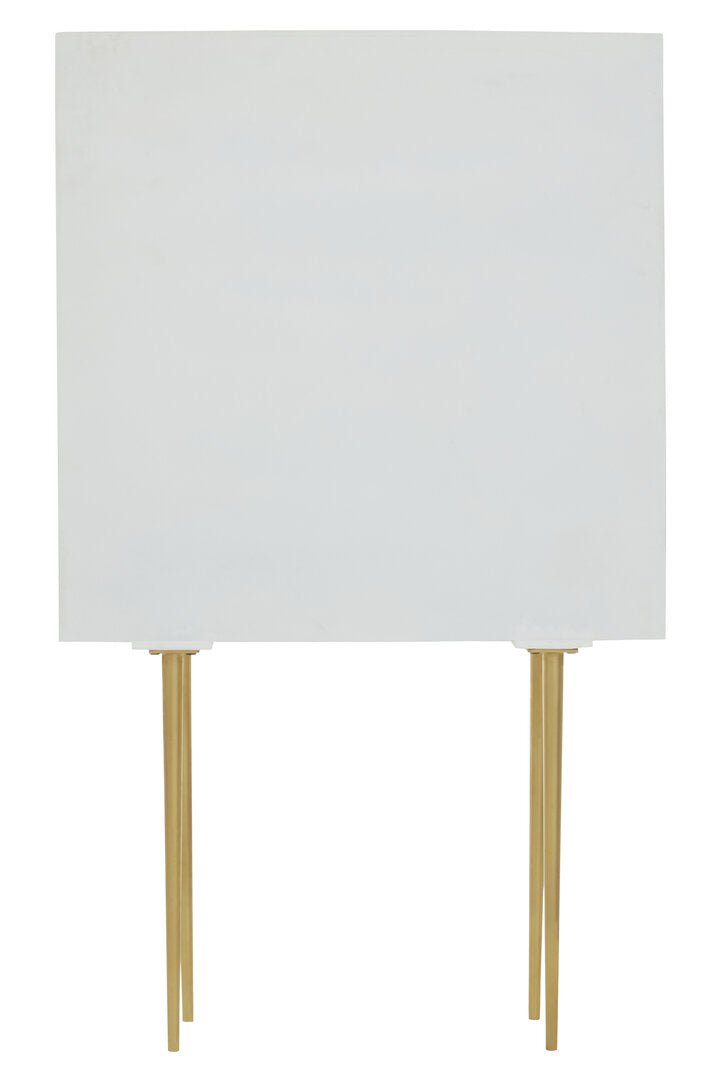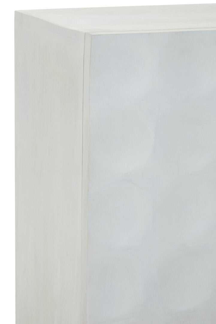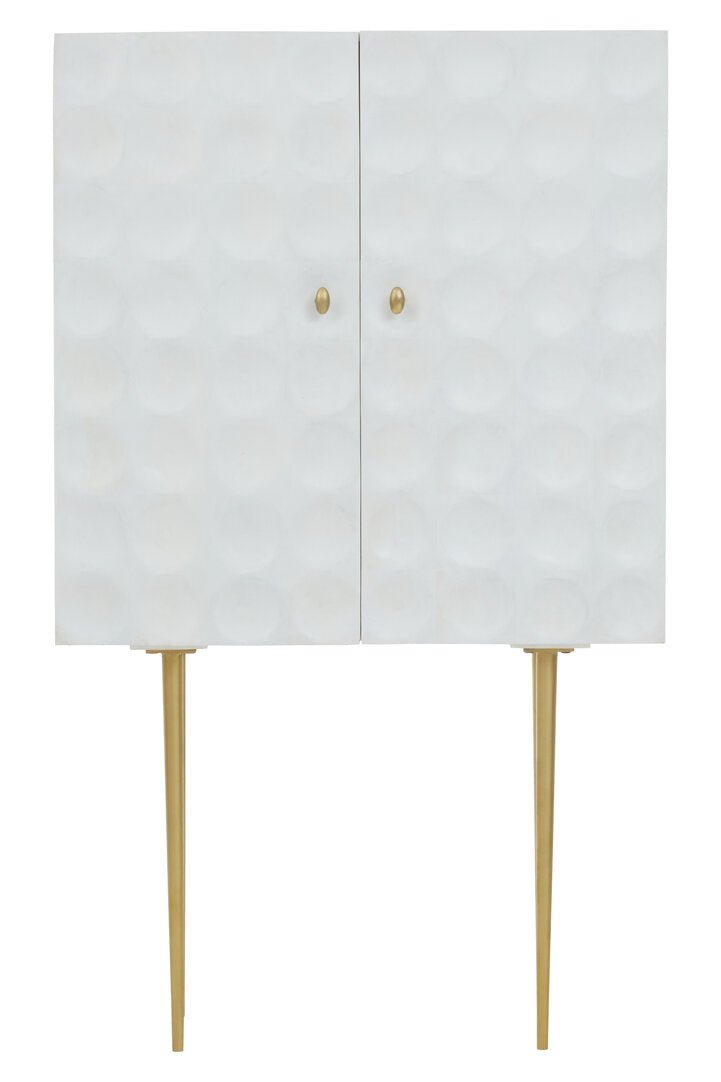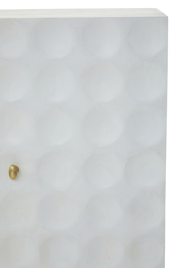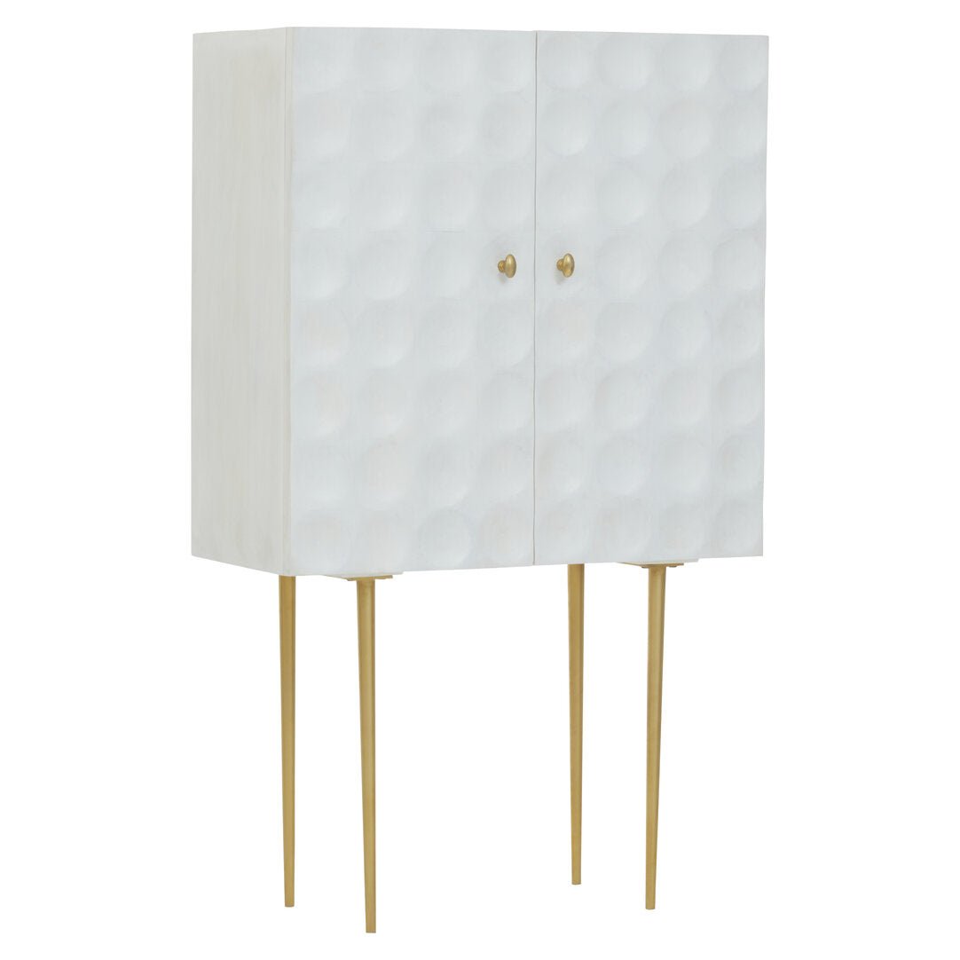 This two door cabinet is an elegant combination of storage and design. Made from mango wood, this cream finish cabinet with subverted indents in a round shape creates an art deco allure. Slim metal legs in the antique brass finish add a warm contrast.