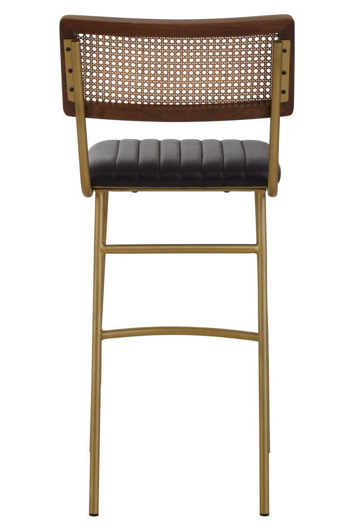 This bar chair creates a stylish look with a mix of modern elements. The padded seat is upholstered in genuine black leather, featuring channel tufting, which contrasts elegantly with the gold finish iron frame.