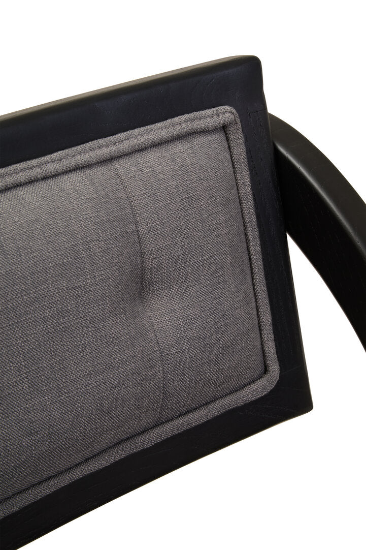 This folding chair combines modern functionality with understated elegance. It features a visually appealing frame crafted from black elm wood, with a gently curved backrest that add a subtle softness to its shape. A grey fabric seat and backrest add tactile warmth and contrast to the wood’s natural grain. Slightly angled legs contribute to stability, while the integrated folding mechanism ensures easy storage with a slim profile.