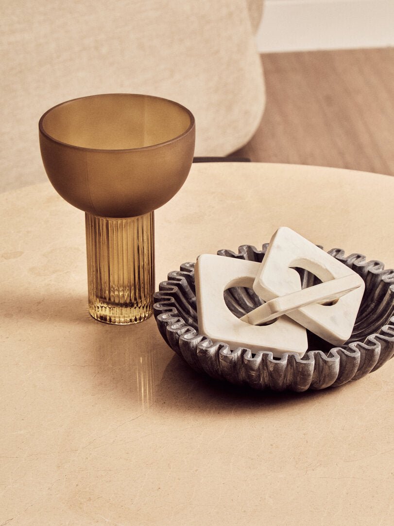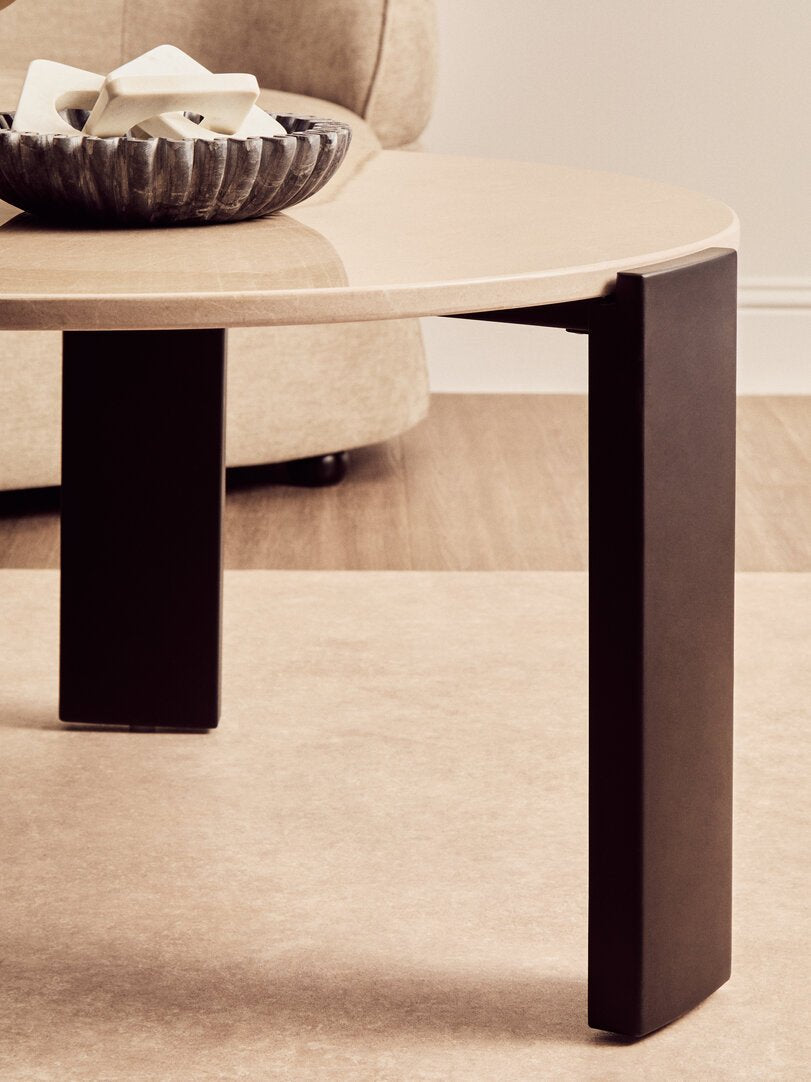 This round coffee table has a cream marble top in a smooth finish, offering a touch of luxury to the living room. Crafted from black finish acacia wood, its sturdy legs create a striking and visually appealing design, making this monochromatic coffee table a perfect focal point for modern living rooms.