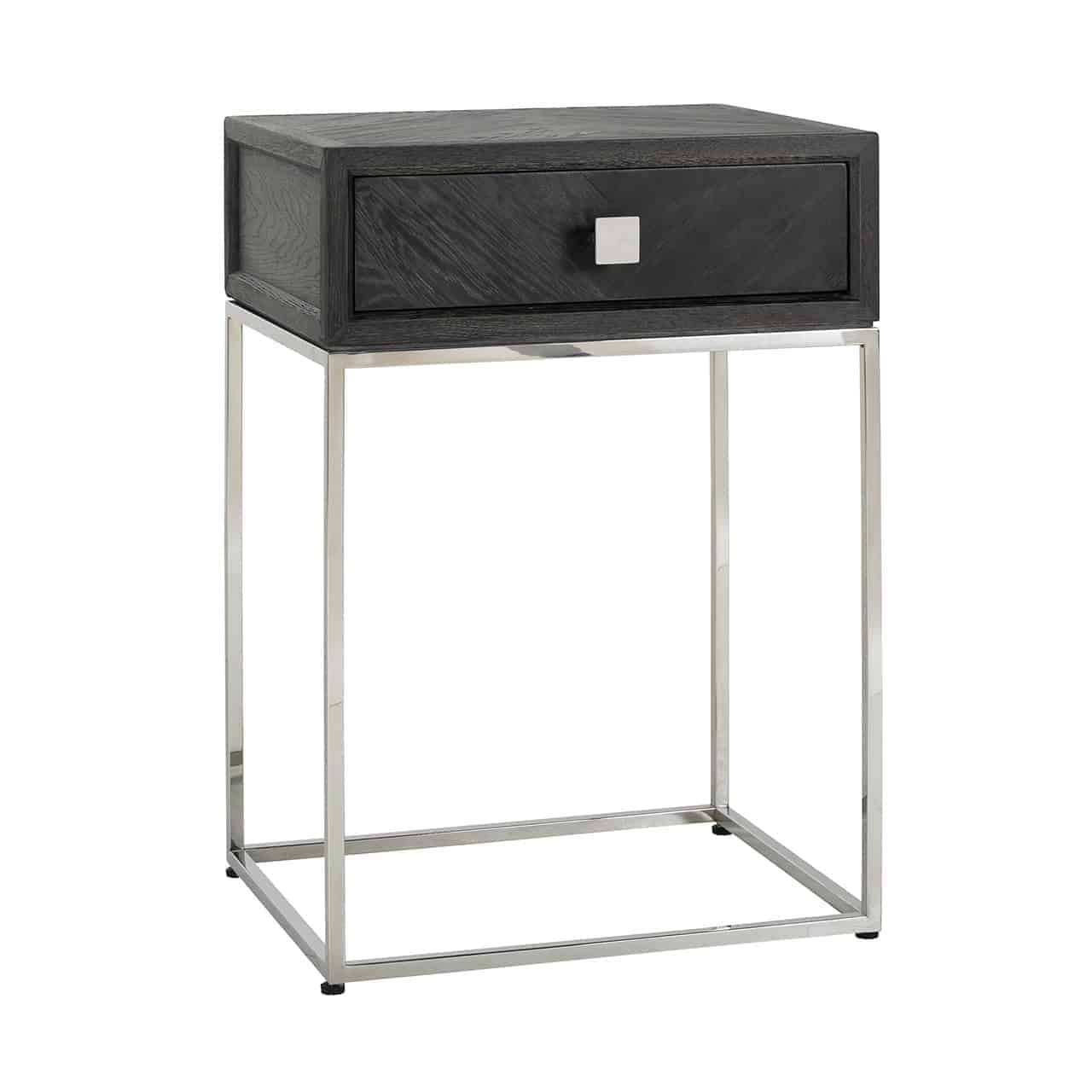 Blackbone silver 1-drawer nightstand is made of oak and stainless steel. The black bedside table from the Blackbone collection gives your bedroom an elegant, yet sturdy touch. Also available with gold.