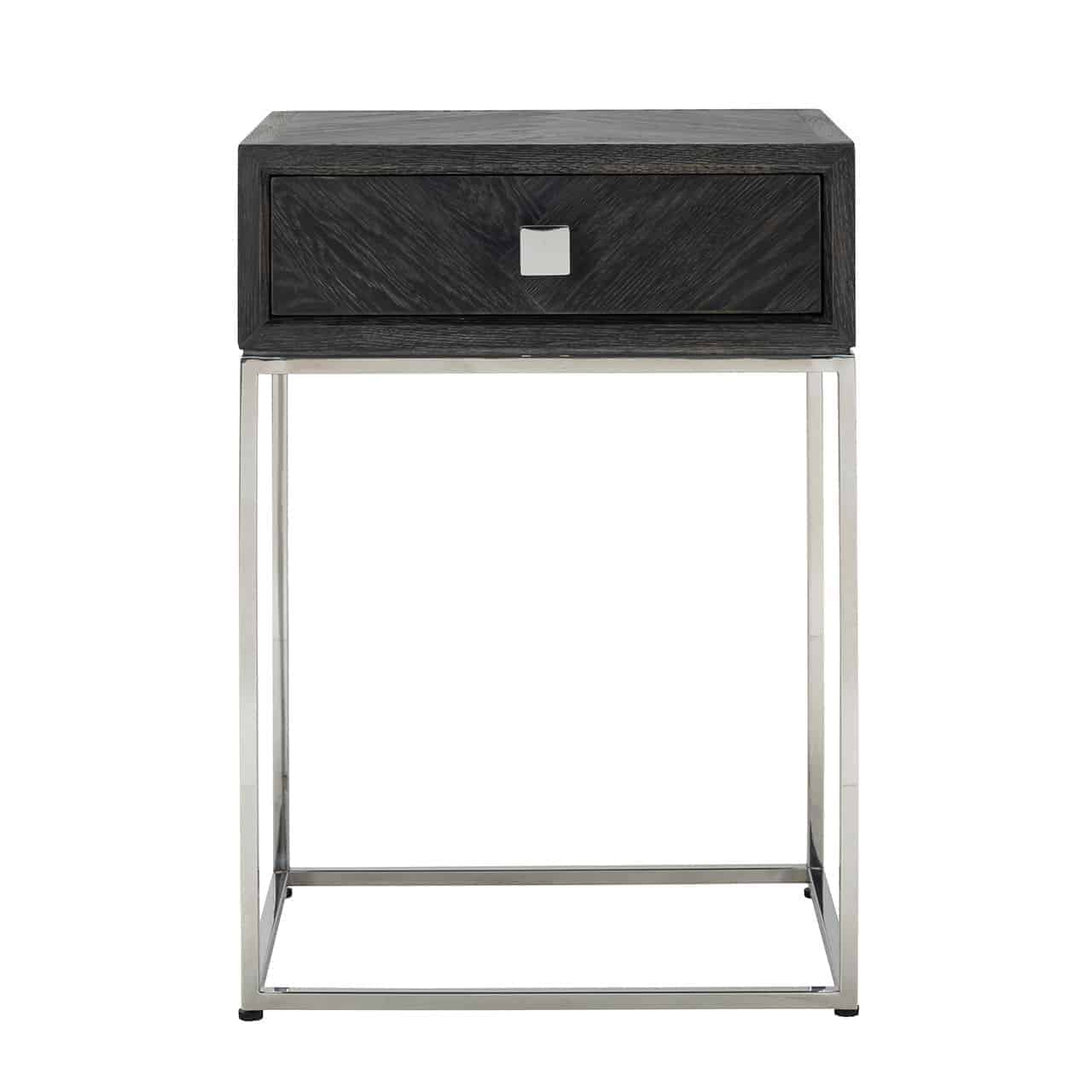 Nachttisch Blackbone Silber 1-Schublade besteht aus Eiche und Edelstahl. Der schwarze Nachttisch aus der Blackbone-Kollektion verleiht Ihrem Schlafzimmer eine elegante und dennoch robuste Note. Auch mit Gold erhältlich.