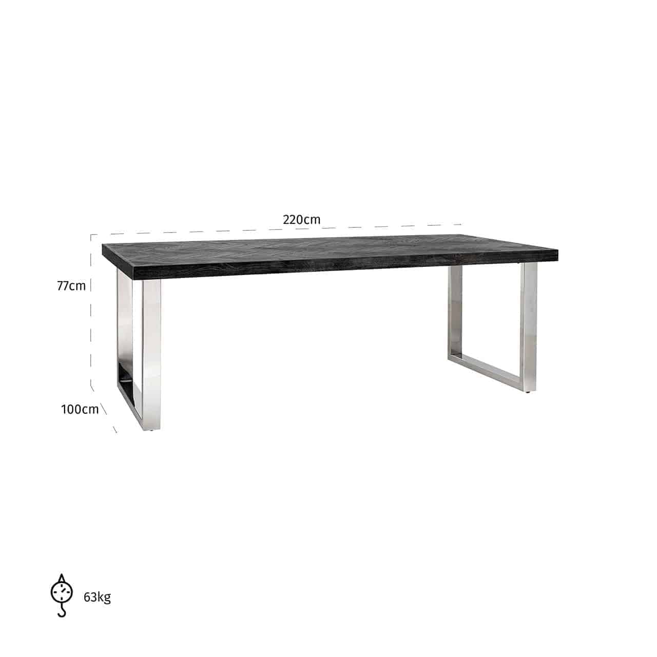 Dining table Blackbone silver 220 is made of oak and stainless steel. The black dining table from the Blackbone collection gives your interior an elegant, yet sturdy touch. Also available with gold.
