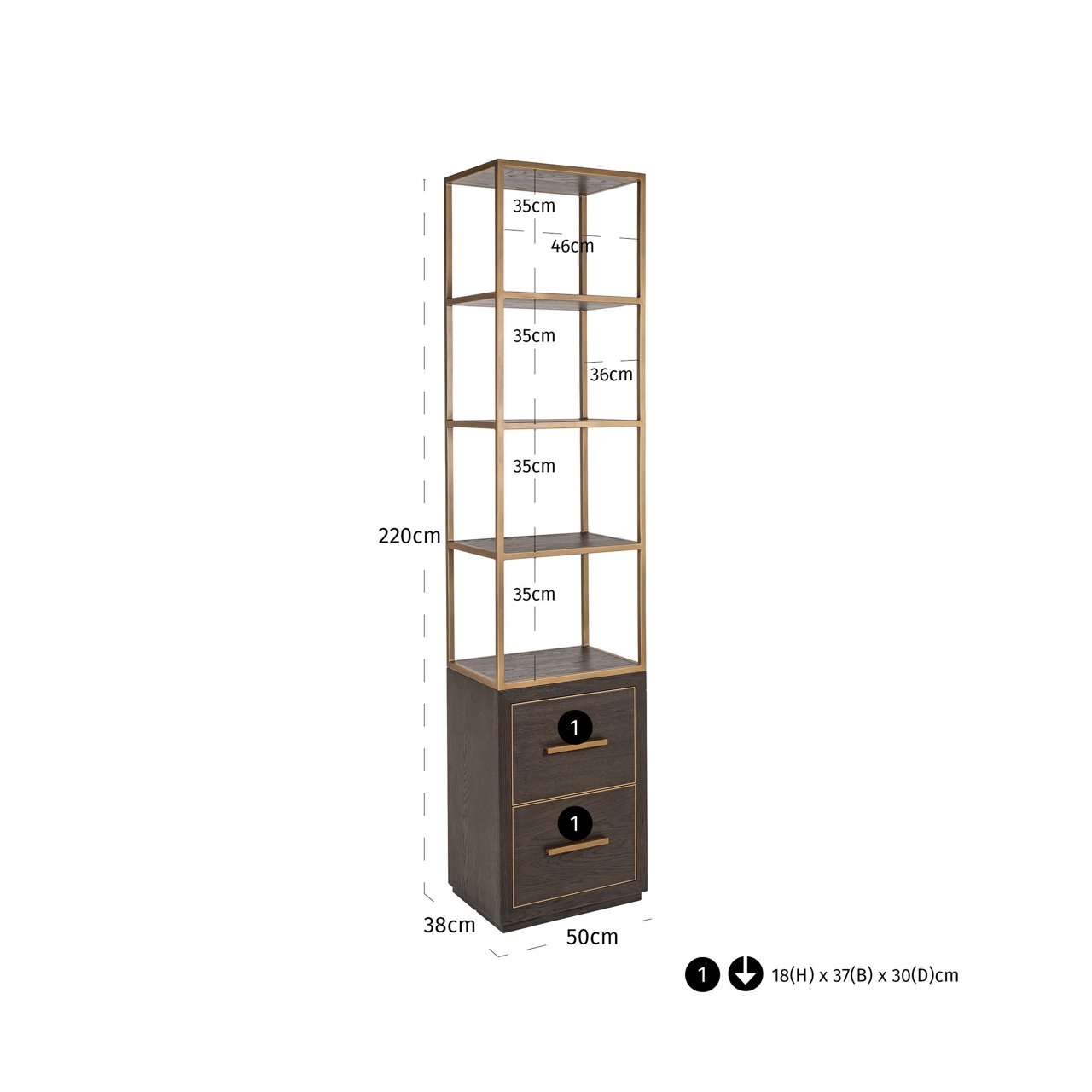 Display cabinet Carter small features two drawers and open shelving above. A compact piece with a minimalist, open design. Ideal for both display and storage.