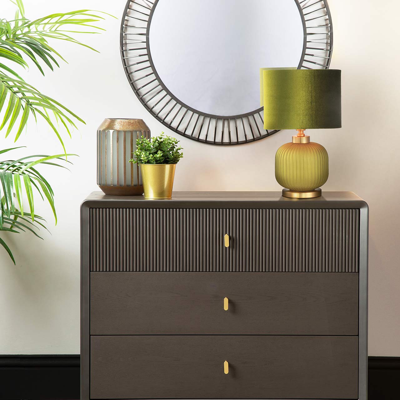 44.5cm Frost Green Pleated Glass Table Lamp with Green Velvet Shade-Gold Ins- E27 Dual Plug