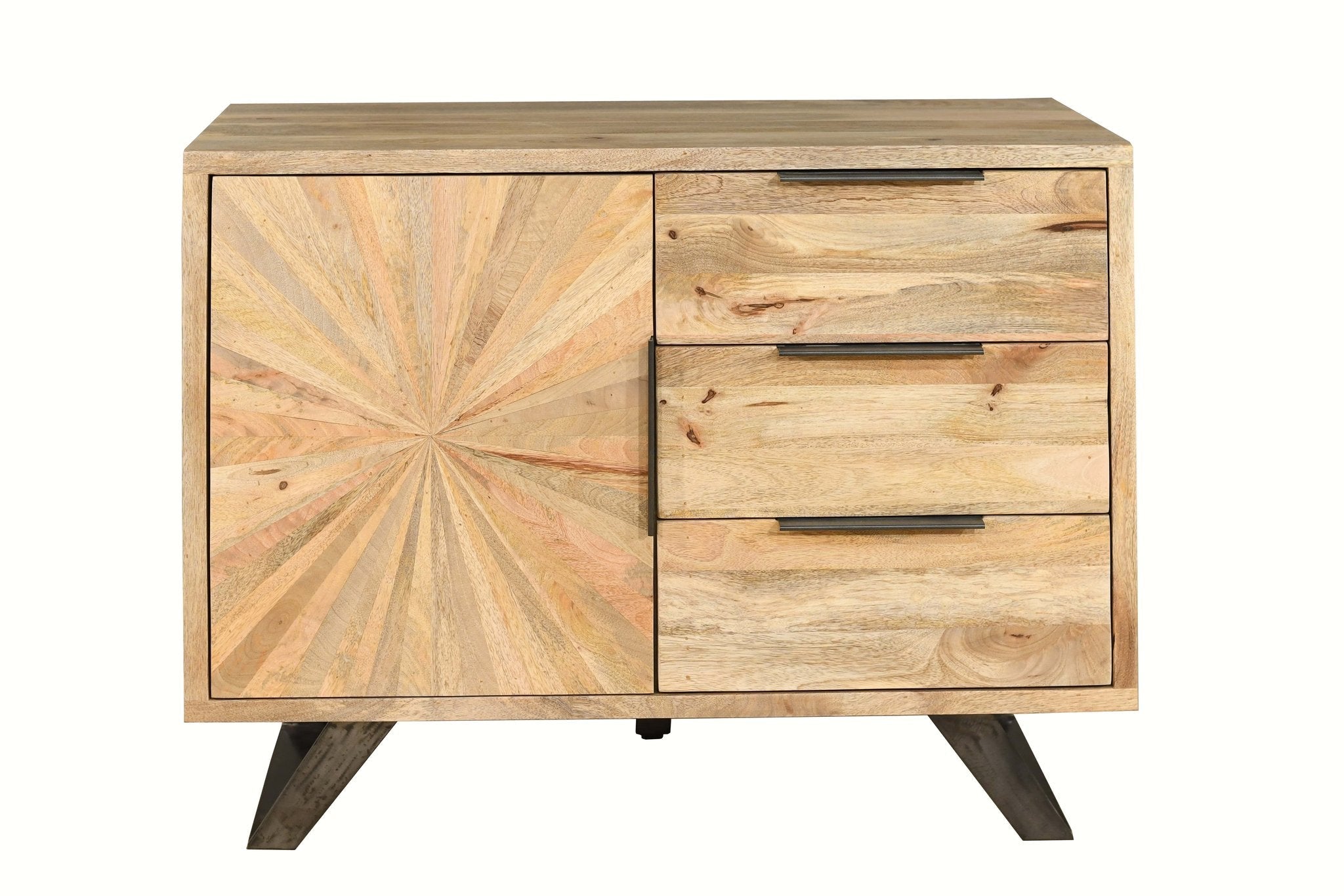 Kodi Range: Light mango wood featuring slim-line handles and a signature sunburst pattern design. Crafted with precision inlay work, each piece showcases the natural beauty and unique grain of mango wood.