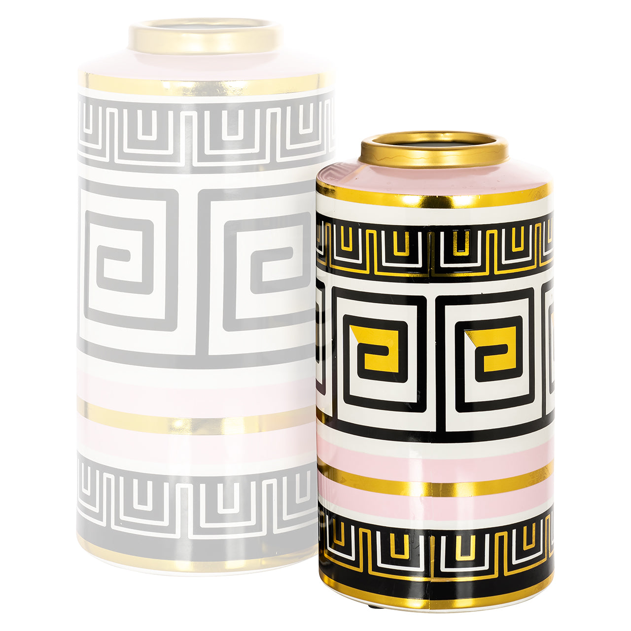 The Vase Leora, a beautiful decorative piece available in both large and small sizes, distinguishes itself with a colorful design enriched with pink and gold accents. This vase elegantly combines vibrant colors, making it a striking and cheerful addition to any interior. The small variant is ideal for adding a colorful accent to compact spaces or as a delicate decoration on tables and shelves. The larger size of the Leora vase makes a powerful statement and is perfect for displaying larger flower arrangements or as a central art piece in your living or workspace.