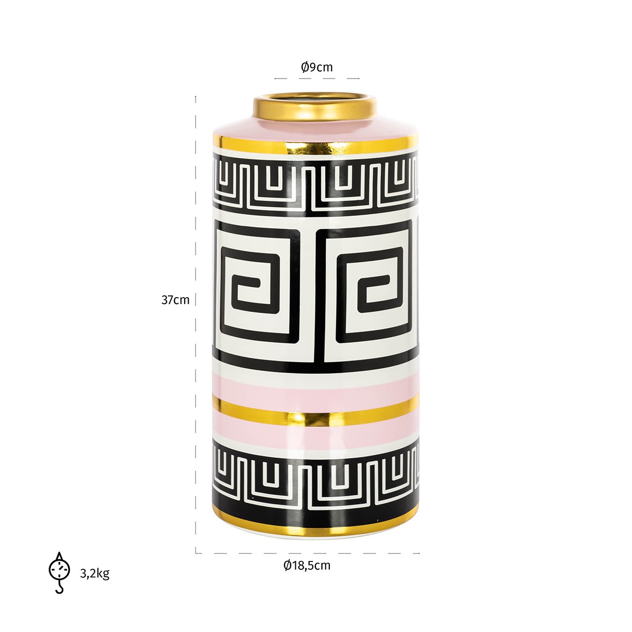 The Vase Leora, a beautiful decorative piece available in both large and small sizes, distinguishes itself with a colorful design enriched with pink and gold accents. This vase elegantly combines vibrant colors, making it a striking and cheerful addition to any interior. The small variant is ideal for adding a colorful accent to compact spaces or as a delicate decoration on tables and shelves. The larger size of the Leora vase makes a powerful statement and is perfect for displaying larger flower arrangements or as a central art piece in your living or workspace.